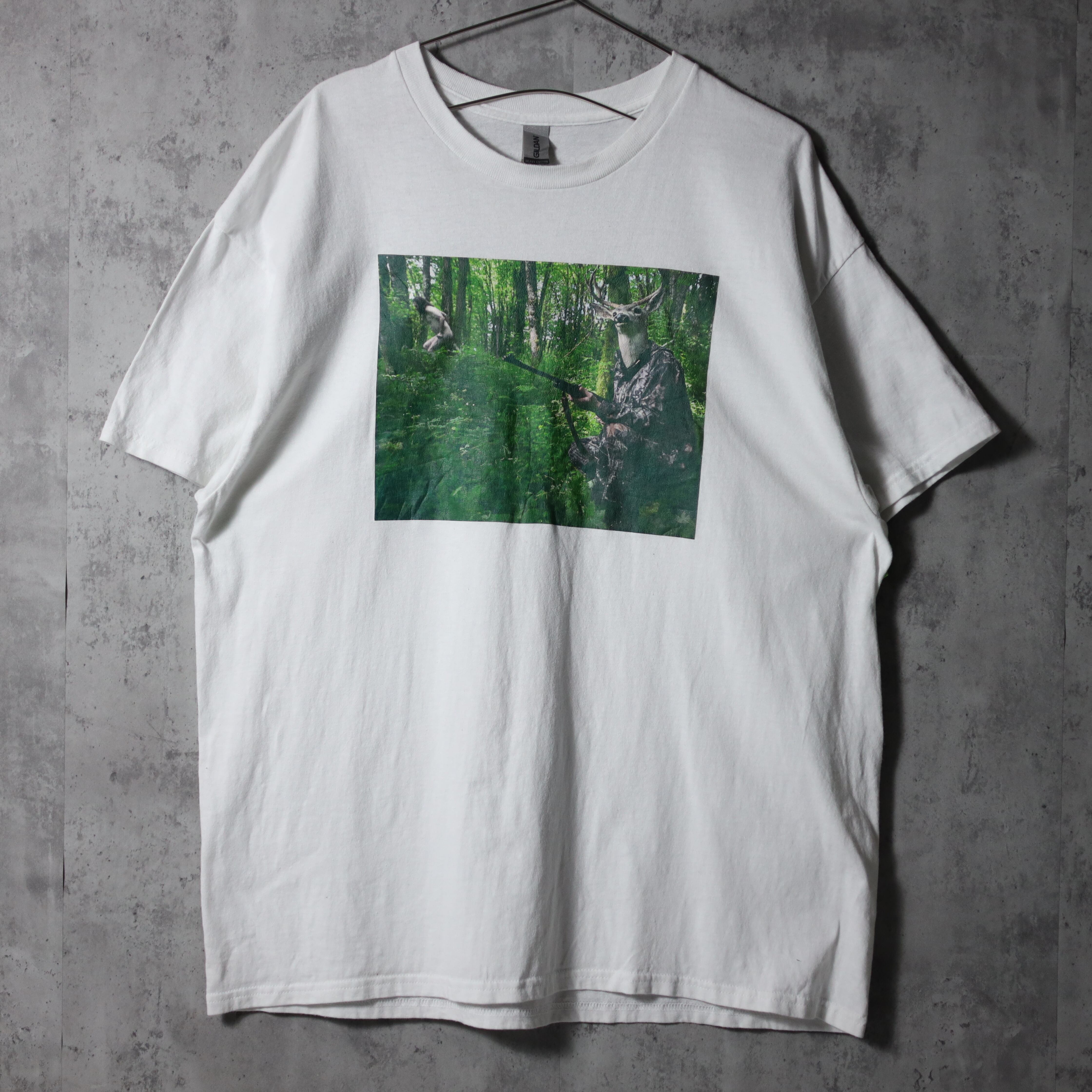 "鹿狩り"の様子がプリントされたtee